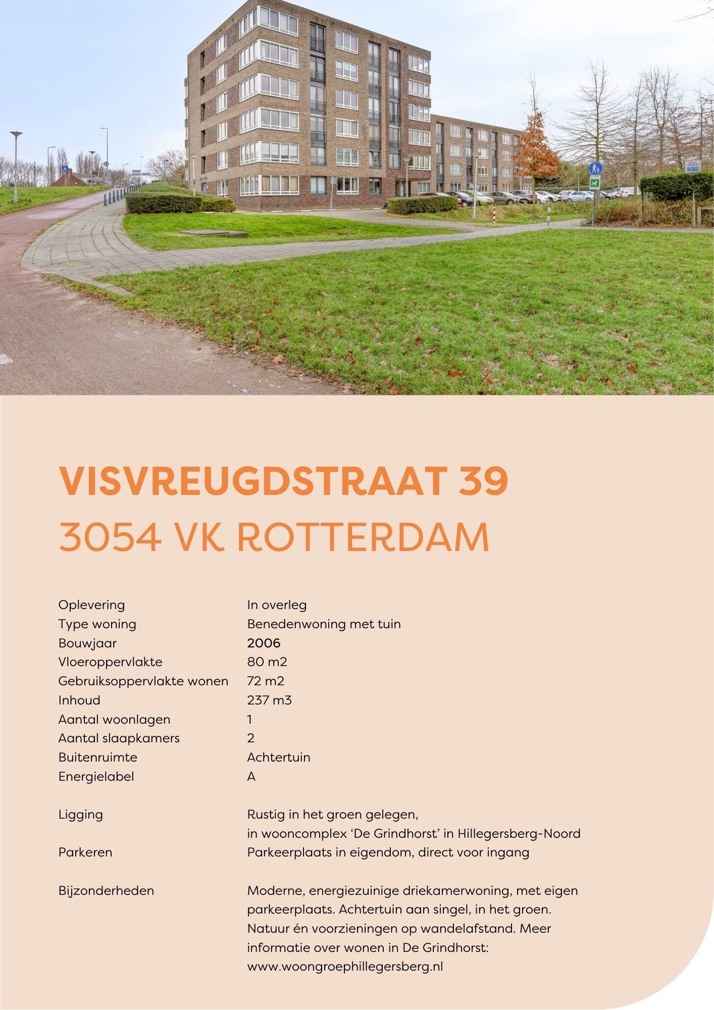 Dit appartement in wooncomplex De Grindhorst biedt comfortabel en levensloopvriendelijk wonen. Je woont zelfstandig, met de mogelijkheid om deel te nemen aan een actieve gemeenschap. Sinds 2006 is hier de Woongroep Hillegersberg gevestigd, waar je bij kunt aansluiten als je dat wenst. Je bepaalt zelf hoe actief je meedoet. Zo geniet je van zelfstandigheid, met de zekerheid van een levendige omgeving.